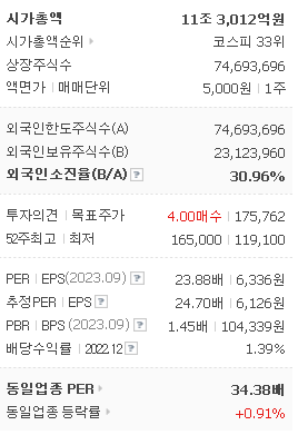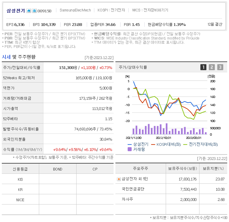 외국인 보유 비중은 30.84% 이며 장중 거래량은 173,159원 을 기록했습니다. 매출액은 66,032억 원을 달성했습니다. EPS는 6,126원이며 삼성전기 주식 배당수익률은 1.61% 입니다.