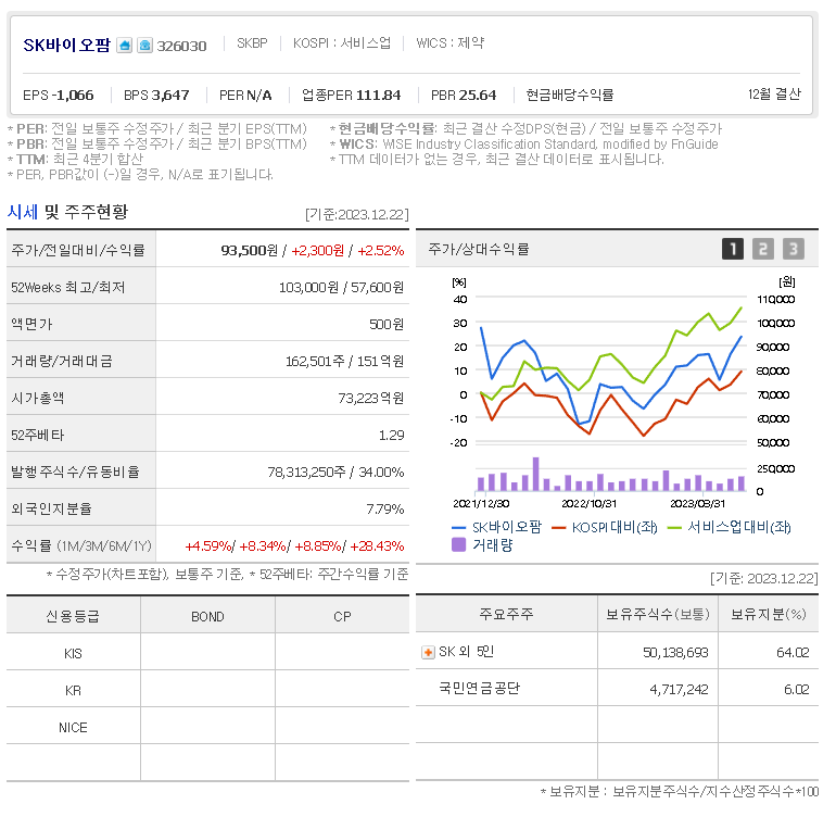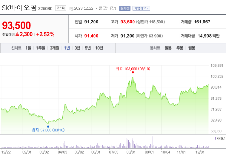 SK바이오팜 현재 주가는 93,500원이며 전일 대비 원의 모습을 보이고 있습니다. SK바이오팜의 주주현황을 살펴보면 SK 주주가 전체 지분 64.02%를 소유하고 있습니다. SK바이오팜는 제약 기업으로 장중 기준으로 주가는 93,500원 입니다. SK바이오팜의 시가 총액은 7조3223억 원이며 발행 주식수는 78,313,250주 입니다.