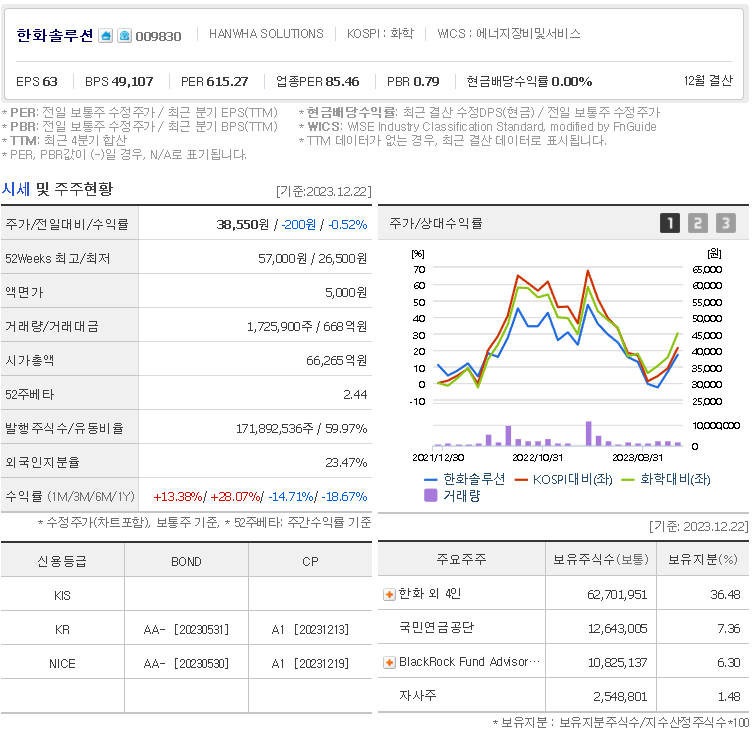 한화솔루션 현재 주가는 38,550원이며 전일 대비 -200원의 모습을 보이고 있습니다. 한화솔루션의 주주현황을 살펴보면 한화 주주가 전체 지분 36.48%를 소유하고 있습니다. 한화솔루션는 에너지 시설 및 서비스 기업으로 장중 기준으로 주가는 38,550원 입니다. 한화솔루션의 시가 총액은 6조6265억 원이며 발행 주식수는 171,892,536주 입니다.