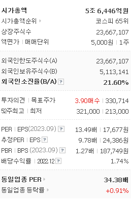 외국인 보유 비중은 21.59% 이며 장중 거래량은 101,426원 을 기록했습니다. 매출액은 130,467억 원을 달성했습니다. EPS는 24,386원이며 LG이노텍 주식 배당수익률은 1.64% 입니다.