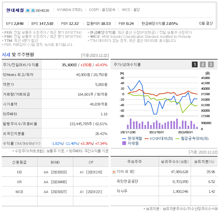 현대제철 현재 주가는 35,100원이며 전일 대비 -1.82원의 모습을 보이고 있습니다. 현대제철의 주주현황을 살펴보면 기아 주주가 전체 지분 35.96%를 소유하고 있습니다. 현대제철는 금속 및 광물 기업으로 장중 기준으로 주가는 35,100원 입니다. 현대제철의 시가 총액은 4조6839억 원이며 발행 주식수는 133,445,785주 입니다.