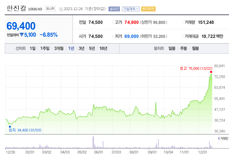 한진칼 현재 주가는 74,500원이며 전일 대비 원의 모습을 보이고 있습니다. 한진칼의 주주현황을 살펴보면 조원태 주주가 전체 지분 29.32%를 소유하고 있습니다. 한진칼는 항공운수 기업으로 장중 기준으로 주가는 74,500원 입니다. 한진칼의 시가 총액은 4조6333억 원이며 발행 주식수는 66,762,279주 입니다.