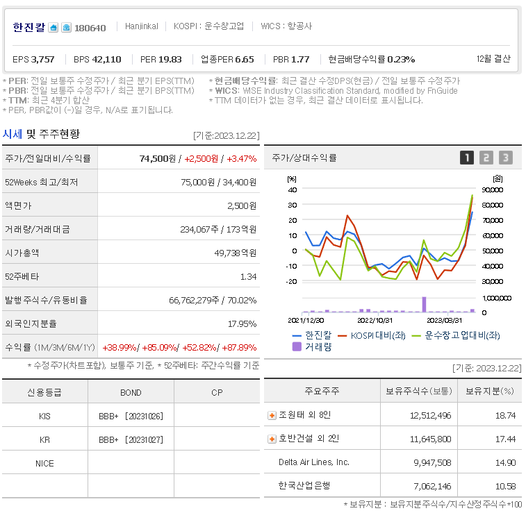 외국인 보유 비중은 17.95% 이며 장중 거래량은 234,067원 을 기록했습니다. 매출액은 2,048억 원을 달성했습니다. EPS는 4,116원이며 한진칼 주식 배당수익률은 2.22% 입니다.