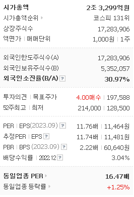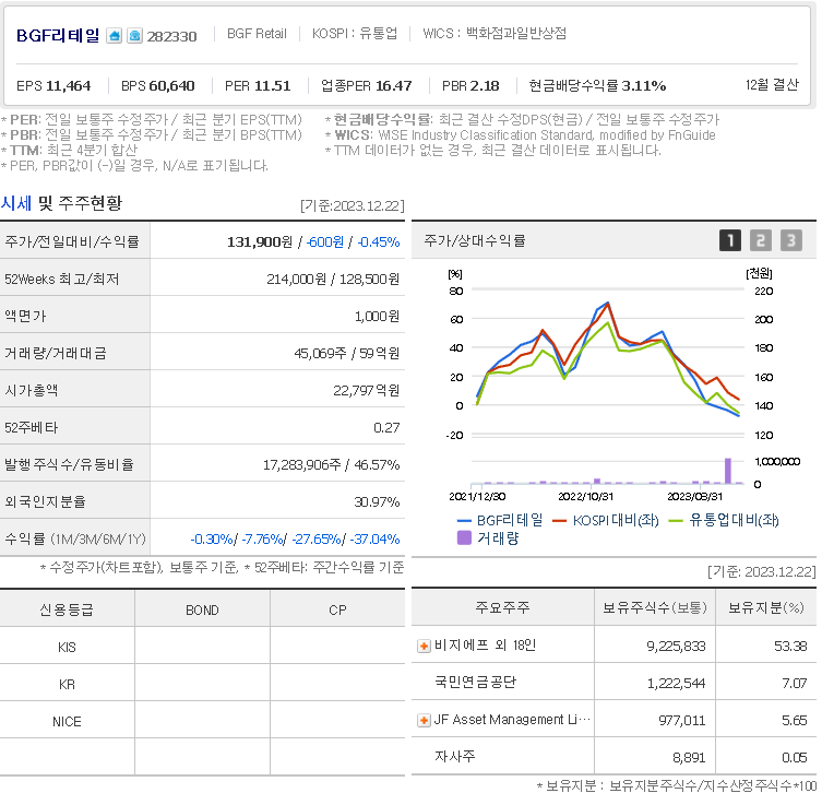 외국인 보유 비중은 30.94% 이며 장중 거래량은 45,069원 을 기록했습니다. 매출액은 61,546억 원을 달성했습니다. EPS는 11,481원이며 BGF리테일 주식 배당수익률은 1.95% 입니다.