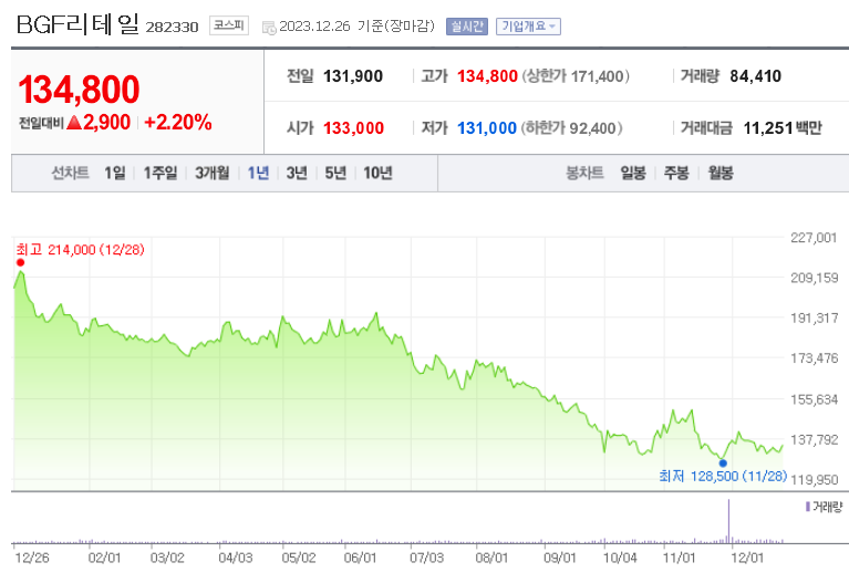 BGF리테일 현재 주가는 131,900원이며 전일 대비 -600원의 모습을 보이고 있습니다. BGF리테일의 주주현황을 살펴보면 비지에프 주주가 전체 지분 53.38%를 소유하고 있습니다. BGF리테일는 도소매 기업으로 장중 기준으로 주가는 131,900원 입니다. BGF리테일의 시가 총액은 2조3299억 원이며 발행 주식수는 17,283,906주 입니다.
