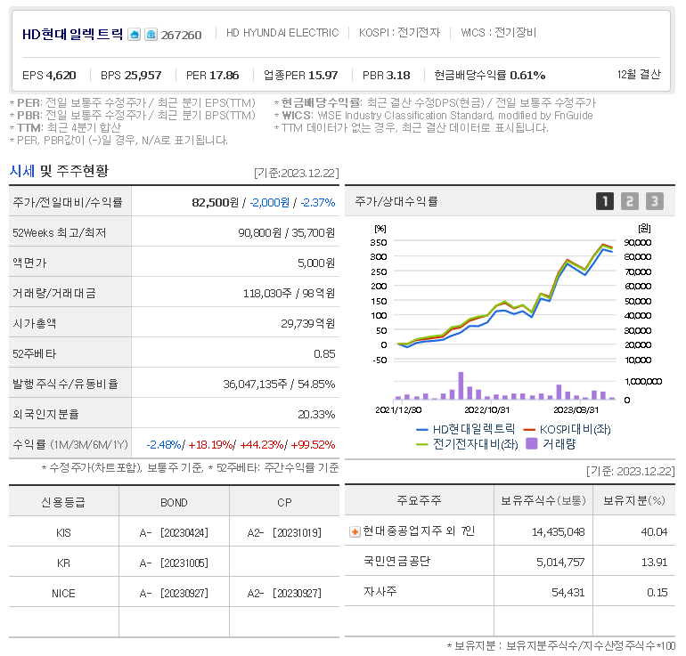 HD현대일렉트릭 현재 주가는 82,500원이며 전일 대비 -2,000원의 모습을 보이고 있습니다. HD현대일렉트릭의 주주현황을 살펴보면 현대중공업지주 주주가 전체 지분 40.04%를 소유하고 있습니다. HD현대일렉트릭는 전기장비 기업으로 장중 기준으로 주가는 82,500원 입니다.