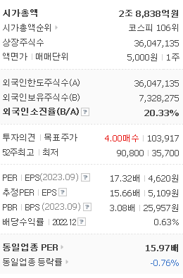 HD현대일렉트릭의 시가 총액은 2조8838억 원이며 발행 주식수는 36,047,135주 입니다. 외국인 보유 비중은 20.37% 이며 장중 거래량은 118,030원 을 기록했습니다. 매출액은 19,055억 원을 달성했습니다. EPS는 5,109원이며 HD현대일렉트릭 주식 배당수익률은 1.18% 입니다.