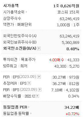 외국인 보유 비중은 8.48% 이며 장중 거래량은 1,386,351원 을 기록했습니다. 매출액은 5,020억 원을 달성했습니다. EPS는 812원이며 이수페타시스 주식 배당수익률은 1.04% 입니다.