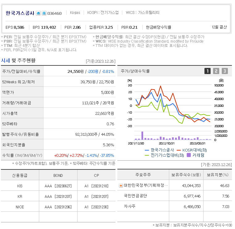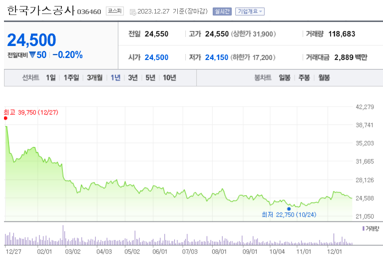 한국가스공사 현재 주가는 24,550원이며 전일 대비 -200원의 모습을 보이고 있습니다. 한국가스공사의 주주현황을 살펴보면 대한민국정부(기획재정부) 주주가 전체 지분 46.63%를 소유하고 있습니다. 한국가스공사는 가스 기업으로 장중 기준으로 주가는 24,550원 입니다. 한국가스공사의 시가 총액은 2조2617억 원이며 발행 주식수는 92,313,000주 입니다.
