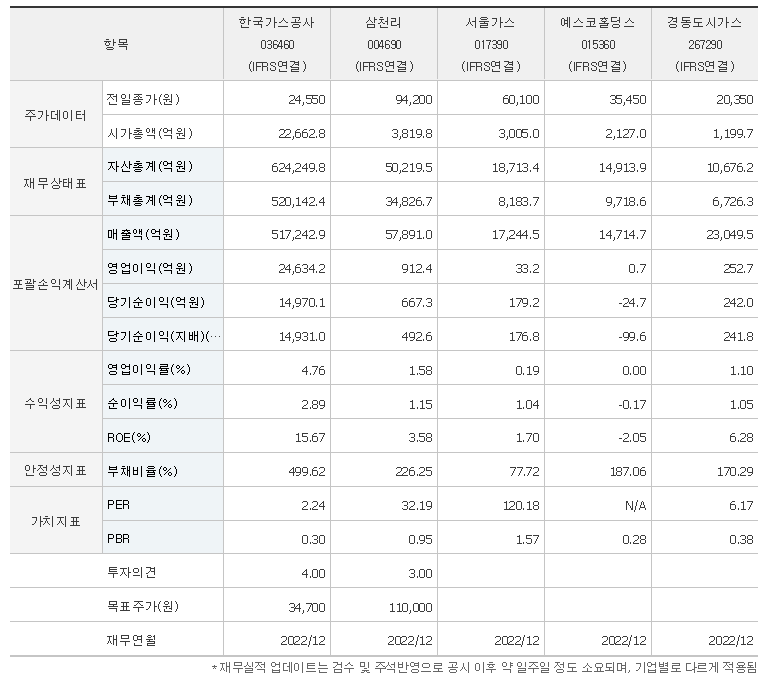 -2023년 6월 전년동기 대비 연결기준 매출액은 14.1% 증가, 영업이익은 34% 감소, 당기순이익은 92.6% 감소. 평균기온 상승 및 요금 인상, 가격경쟁력 하락으로 도시가스용 판매물량 전반기 대비 10.8% 감소, 민간 직수입 LNG 발전 증가 등으로 발전용 판매물량 8.9% 감소. 판매물량 감소에도 판매단가 상승으로 매출액 증가하였으나, 취약계층 지원, 차입금 증가 등으로 영업이익과 당기순이익 감소함.