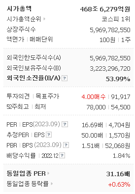 외국인 보유 비중은 54.01% 이며 장중 거래량은 17,797,536원 을 기록했습니다. 매출액은 1,911,556억 원을 달성했습니다. EPS는 1,570원이며 삼성전자 주식 배당수익률은 2.61% 입니다.