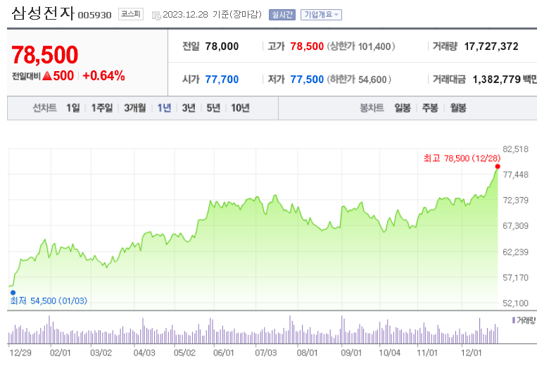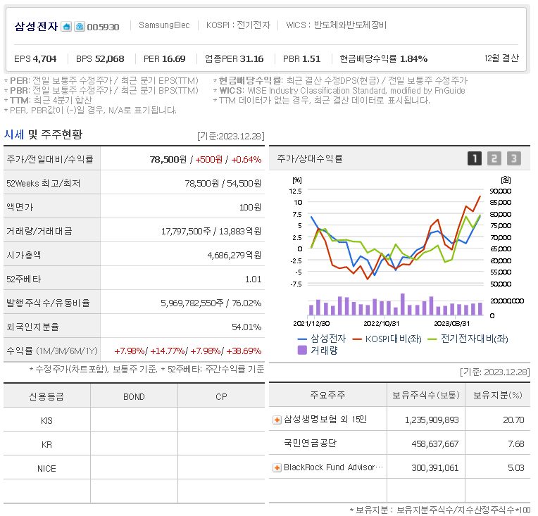 삼성전자 현재 주가는 78,500원이며 전일 대비 원의 모습을 보이고 있습니다. 삼성전자의 주주현황을 살펴보면 삼성생명보험 주주가 전체 지분 20.70%를 소유하고 있습니다. 삼성전자는 반도체 및 관련장비 기업으로 장중 기준으로 주가는 78,500원 입니다. 삼성전자의 시가 총액은 468조6279억 원이며 발행 주식수는 5,969,782,550주 입니다.