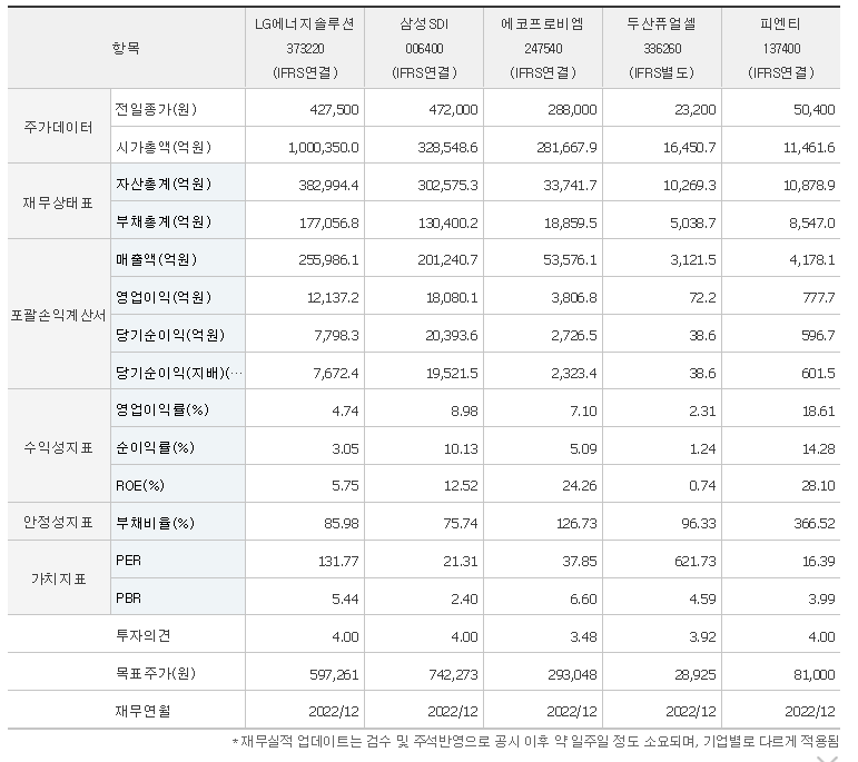 -동사는 LG화학에서 분할되어 신설되었으며, EV, ESS 등에 적용되는 배터리 제품의 개발, 제조, 판매 하는 사업을 영위하고 있음. EV용 배터리의 경우 경쟁사 대비 앞선 개발과 공급 및 높은 에너지 밀도 등의 제품 경쟁력을 기반으로 Global 자동차 OEM 대부분을 고객으로 확보하였음. 2023년 3분기 기준 세계시장에서 EV용 배터리 점유율 14.3%를 차지하고 있음.