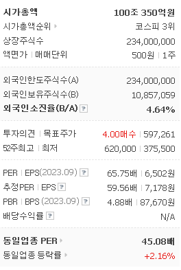 LG에너지솔루션의 시가 총액은 100조350억 원이며 발행 주식수는 234,000,000주 입니다. 외국인 보유 비중은 4.68% 이며 장중 거래량은 190,673원 을 기록했습니다. 매출액은 257,441억 원을 달성했습니다. EPS는 7,178원이며 LG에너지솔루션 주식 배당수익률은 % 입니다.