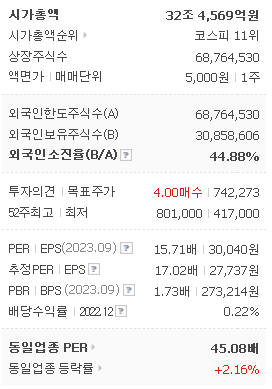 외국인 보유 비중은 44.99% 이며 장중 거래량은 301,048원 을 기록했습니다. 매출액은 171,435억 원을 달성했습니다. EPS는 27,737원이며 삼성SDI 주식 배당수익률은 0.17% 입니다.