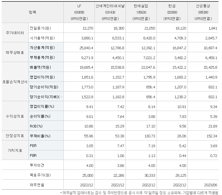 -2023년 9월 전년동기 대비 연결기준 매출액은 5.5% 감소, 영업이익은 91.1% 감소, 당기순이익은 51.7% 감소. 국내 패션 및 식품 사업은 안정적으로 운영되며 하방을 지지하고 있으나 코람코자산의 실적 변동성이 기업가치의 프리미엄 하락으로 작용함. 부동산 사업은 연간 영업이익 600억원 수준에서 안정적인 성장이 지속될 수 있도록 리츠 중심의 수익구조로 점진 재편중임.