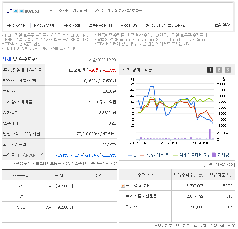 외국인 보유 비중은 16.64% 이며 장중 거래량은 21,830원 을 기록했습니다. 매출액은 13,323억 원을 달성했습니다. EPS는 2,059원이며 LF 주식 배당수익률은 3,880% 입니다.