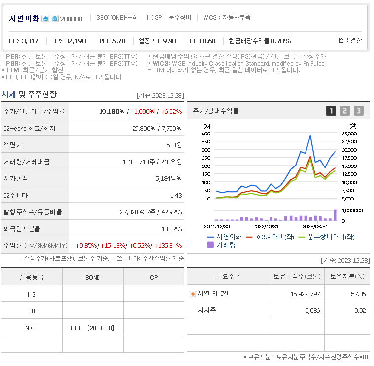 서연이화 현재 주가는 19,180원이며 전일 대비 원의 모습을 보이고 있습니다. 서연이화의 주주현황을 살펴보면 서연 주주가 전체 지분 57.06%를 소유하고 있습니다. 서연이화는 자동차부품 기업으로 장중 기준으로 주가는 19,180원 입니다. 서연이화의 시가 총액은 5184억 원이며 발행 주식수는 27,028,437주 입니다.