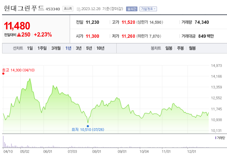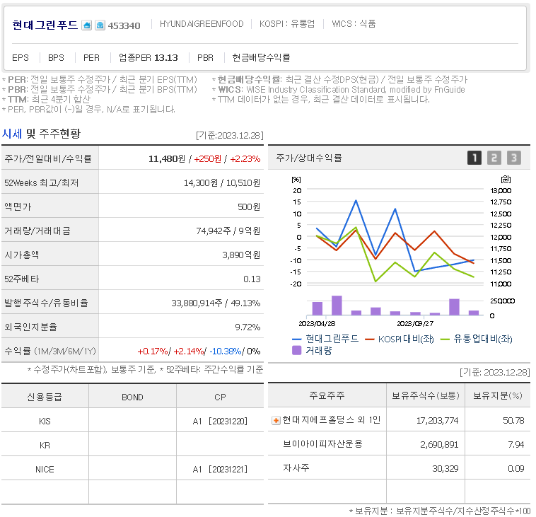 현대그린푸드 현재 주가는 11,480원이며 전일 대비 -10.38원의 모습을 보이고 있습니다. 현대그린푸드의 주주현황을 살펴보면 현대지에프홀딩스 주주가 전체 지분 50.78%를 소유하고 있습니다. 현대그린푸드는 식료품 기업으로 장중 기준으로 주가는 11,480원 입니다. 현대그린푸드의 시가 총액은 3890억 원이며 발행 주식수는 33,880,914주 입니다.