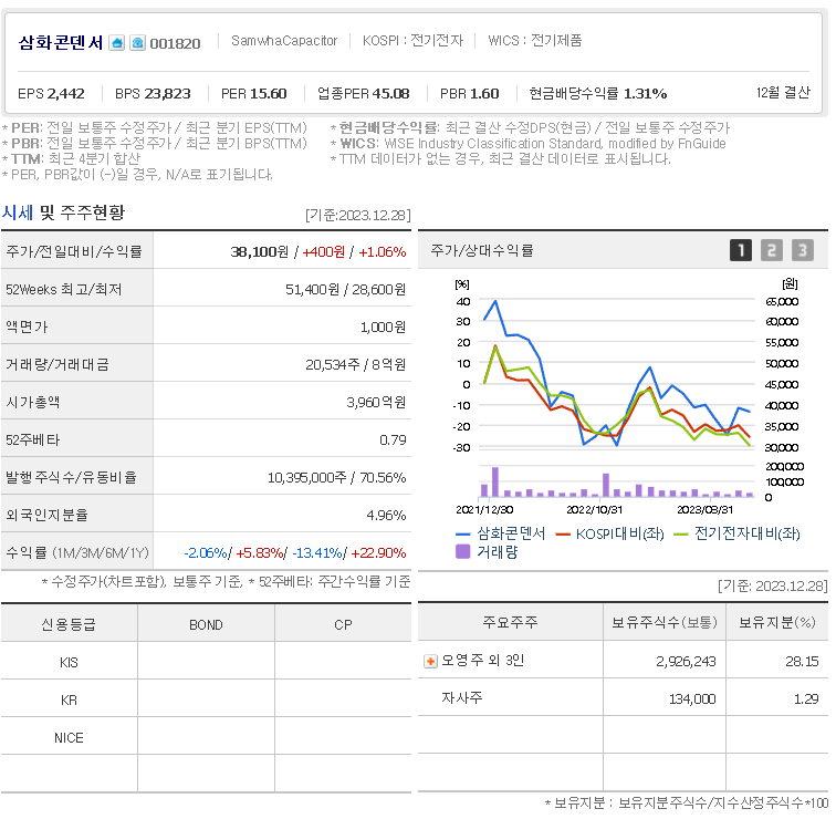 삼화콘덴서 현재 주가는 38,100원이며 전일 대비 -2.06원의 모습을 보이고 있습니다. 삼화콘덴서의 주주현황을 살펴보면 오영주 주주가 전체 지분 28.15%를 소유하고 있습니다. 삼화콘덴서는 전기장비 기업으로 장중 기준으로 주가는 38,100원 입니다. 삼화콘덴서의 시가 총액은 3960억 원이며 발행 주식수는 10,395,000주 입니다.