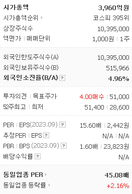 외국인 보유 비중은 4.96% 이며 장중 거래량은 20,534원 을 기록했습니다. 매출액은 2,174억 원을 달성했습니다. EPS는 2,463원이며 삼화콘덴서 주식 배당수익률은 3,907,447% 입니다.
