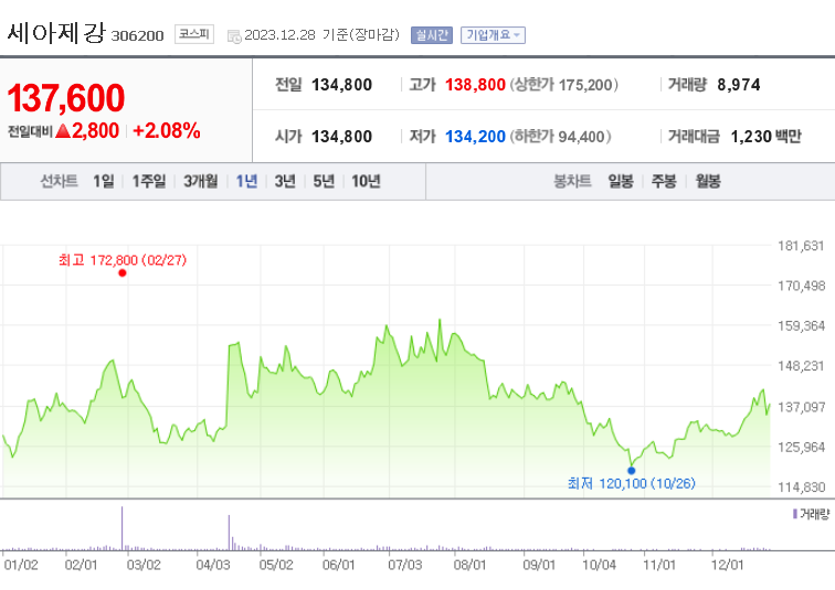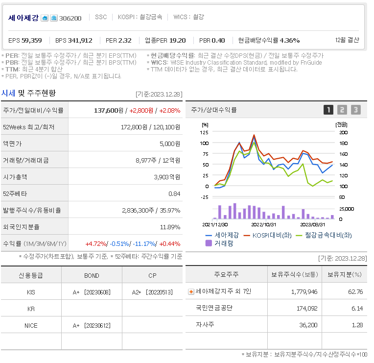세아제강 현재 주가는 137,600원이며 전일 대비 -0.51원의 모습을 보이고 있습니다. 세아제강의 주주현황을 살펴보면 세아제강지주 주주가 전체 지분 62.76%를 소유하고 있습니다. 세아제강는 금속 및 광물 기업으로 장중 기준으로 주가는 137,600원 입니다. 세아제강의 시가 총액은 3903억 원이며 발행 주식수는 2,836,300주 입니다.
