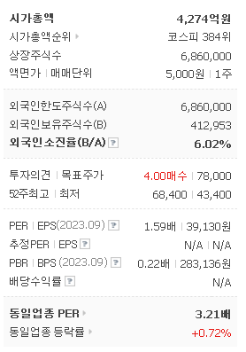 외국인 보유 비중은 5.99% 이며 장중 거래량은 38,664원 을 기록했습니다. 매출액은 57,239억 원을 달성했습니다. EPS는 35,481원이며 E1 주식 배당수익률은 4,274% 입니다.