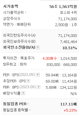 삼성바이오로직스의 시가 총액은 56조1563억 원이며 발행 주식수는 71,174,000주 입니다. 외국인 보유 비중은 10.49% 이며 장중 거래량은 132,038원 을 기록했습니다. 매출액은 26,211억 원을 달성했습니다. EPS는 11,434원이며 삼성바이오로직스 주식 배당수익률은 % 입니다.