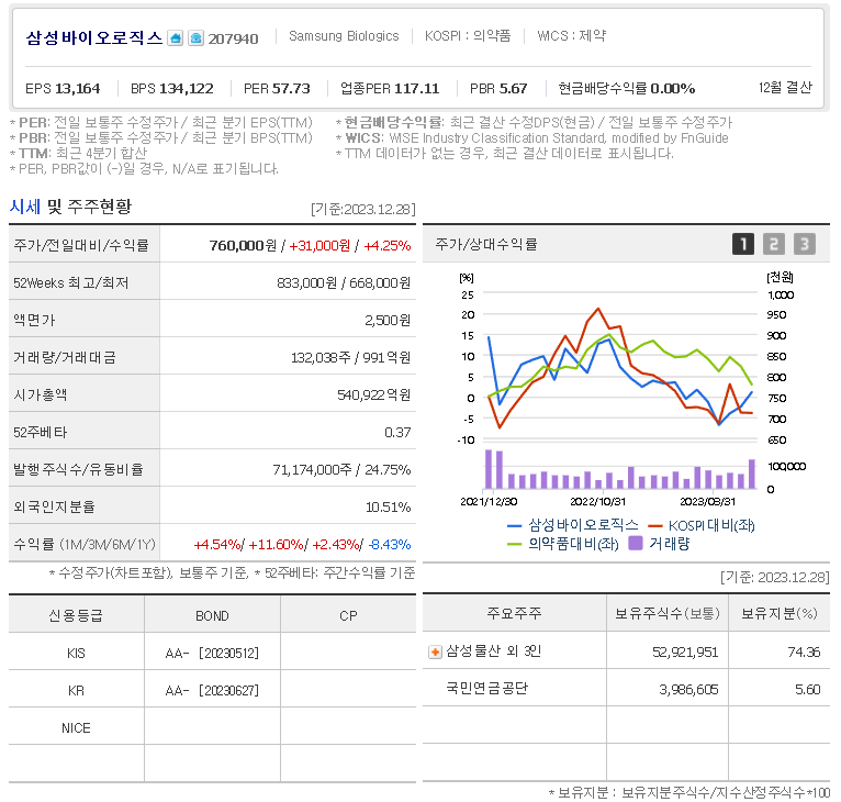 삼성바이오로직스 현재 주가는 760,000원이며 전일 대비 -8.43원의 모습을 보이고 있습니다. 삼성바이오로직스의 주주현황을 살펴보면 삼성물산 주주가 전체 지분 74.36%를 소유하고 있습니다. 삼성바이오로직스는 바이오 기업으로 장중 기준으로 주가는 760,000원 입니다.