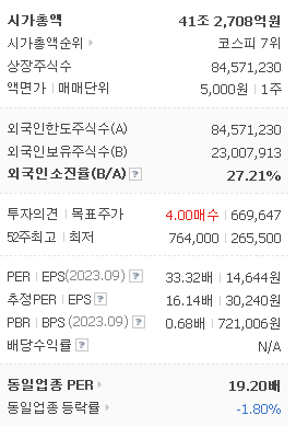 외국인 보유 비중은 27.11% 이며 장중 거래량은 560,329원 을 기록했습니다. 매출액은 584,631억 원을 달성했습니다. EPS는 30,240원이며 POSCO홀딩스 주식 배당수익률은 4.34% 입니다.