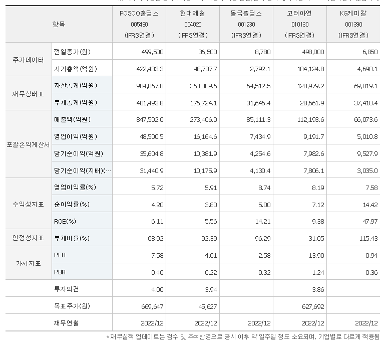 -2023년 9월 전년동기 대비 연결기준 매출액은 10.7% 감소, 영업이익은 38.8% 감소, 당기순이익은 50% 감소. 동사는 전기차용 이차전지의 시장규모 확대를 예상해 설비 확충 등 성장 사업 발굴을 위한 투자에 집중하고 있어서 매출 성장이 기대됨. 철강 판매량은 계절적 비수기와 일부 하공정 라인 수리 영향으로 소폭 감소하여고, 전기차 수요 둔화에 따른 리튬사업 수익성 전망 및 사업가치 할인이 불가피한 상황임.