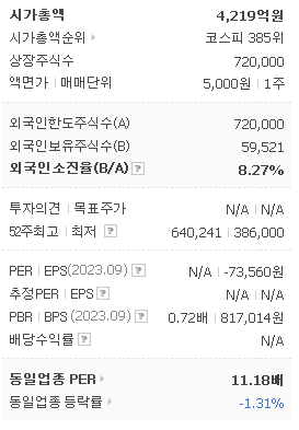 외국인 보유 비중은 8.27% 이며 장중 거래량은 4,943원 을 기록했습니다. 매출액은 7,554억 원을 달성했습니다. EPS는 없음원이며 남양유업 주식 배당수익률은 21,464,421% 입니다.
