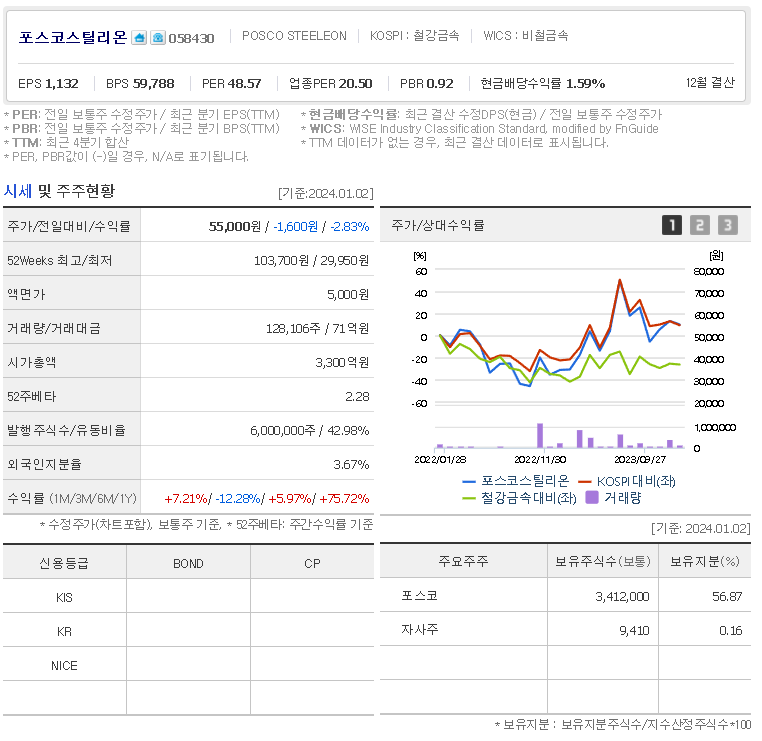 포스코스틸리온 현재 주가는 55,000원이며 전일 대비 -1,600원의 모습을 보이고 있습니다. 포스코스틸리온의 주주현황을 살펴보면 포스코 주주가 전체 지분 56.87%를 소유하고 있습니다. 포스코스틸리온는 금속 및 광물 기업으로 장중 기준으로 주가는 55,000원 입니다. 포스코스틸리온의 시가 총액은 3390억 원이며 발행 주식수는 6,000,000주 입니다.