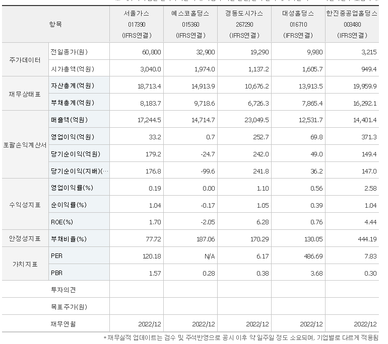 -2023년 9월 전년동기 대비 연결기준 매출액은 6.8% 증가, 영업이익 적자전환, 당기순이익은 11.4% 증가. 동사의 2023년 3분기 도시가스공급 부문의 매출과 부동산 임대 매출이 전년동기 대비 증가했지만 원가율이 악화되고 수도광열비 등의 판관비 또한 증가하면서 영업이익이 적자전환됨. 동사의 도시가스 판매점유율은 수도권지역에서 18.7%, 전국기준으로 9.2%임.