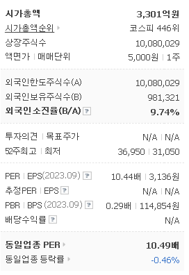 외국인 보유 비중은 9.74% 이며 장중 거래량은 4,573원 을 기록했습니다. 매출액은 3,040억 원을 달성했습니다. EPS는 없음원이며 신도리코 주식 배당수익률은 957,743% 입니다.