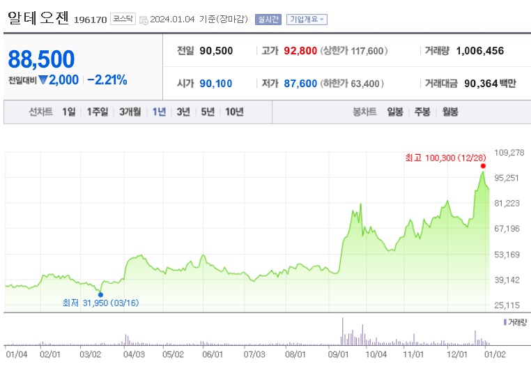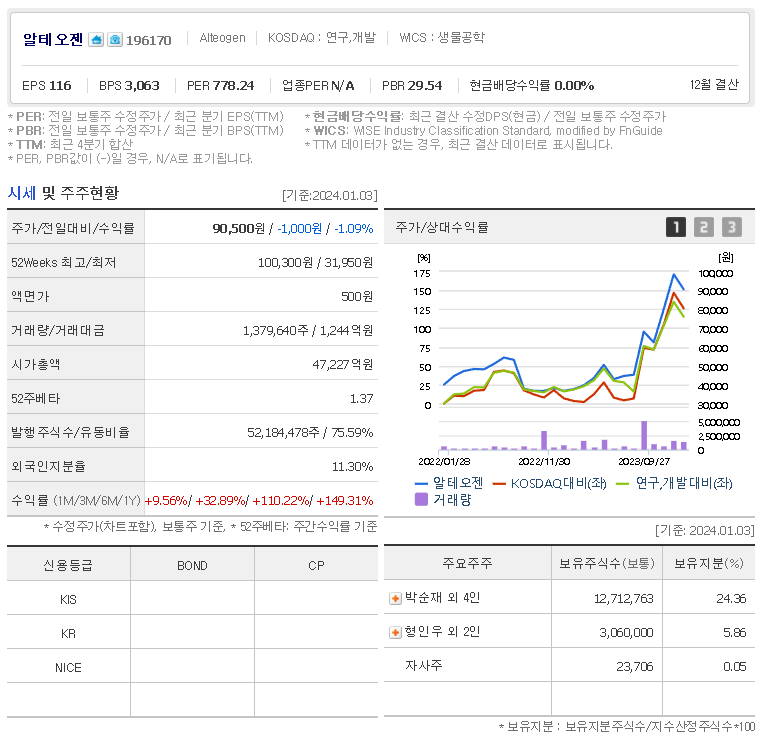 알테오젠 현재 주가는 90,500원이며 전일 대비 -1,000원의 모습을 보이고 있습니다. 알테오젠의 주주현황을 살펴보면 박순재 주주가 전체 지분 24.36%를 소유하고 있습니다. 알테오젠는 바이오 기업으로 장중 기준으로 주가는 90,500원 입니다. 알테오젠의 시가 총액은 4조6183억 원이며 발행 주식수는 52,184,478주 입니다.