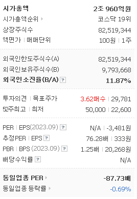 외국인 보유 비중은 11.87% 이며 장중 거래량은 205,057원 을 기록했습니다. 매출액은 7,850억 원을 달성했습니다. EPS는 333원이며 카카오게임즈 주식 배당수익률은 1.20% 입니다.