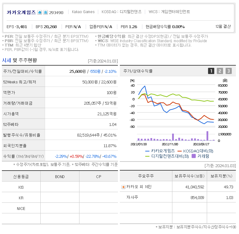 카카오게임즈 현재 주가는 25,600원이며 전일 대비 -550원의 모습을 보이고 있습니다. 카카오게임즈의 주주현황을 살펴보면 카카오 주주가 전체 지분 53.63%를 소유하고 있습니다. 카카오게임즈는 게임 소프트웨어 기업으로 장중 기준으로 주가는 25,600원 입니다. 카카오게임즈의 시가 총액은 2조960억 원이며 발행 주식수는 82,519,644주 입니다.