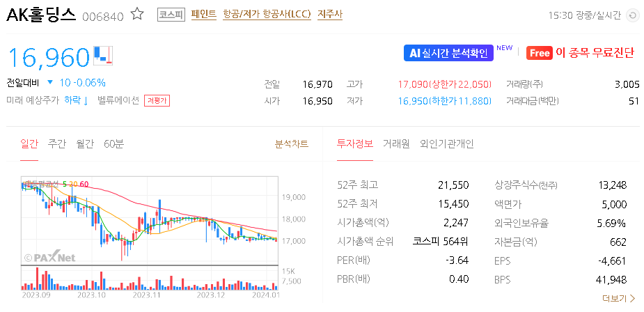 외국인 보유 비중은 5.69% 이며 장중 거래량은 5,254원 을 기록했습니다. 매출액은 33,237억 원을 달성했습니다. EPS는 없음원이며 AK홀딩스 주식 배당수익률은 N/A% 입니다.