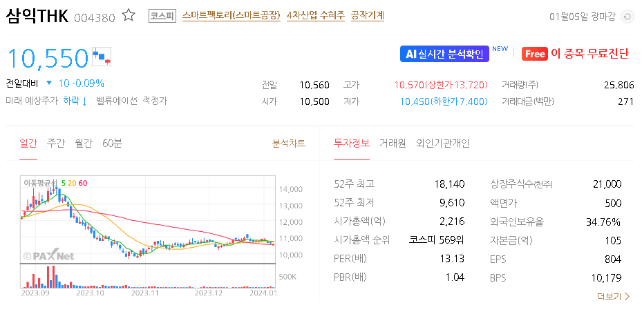 외국인 보유 비중은 34.76% 이며 장중 거래량은 48,116원 을 기록했습니다. 매출액은 2,363억 원을 달성했습니다. EPS는 없음원이며 삼익THK 주식 배당수익률은 20,811,043% 입니다.