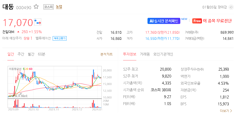 이 글에서는 대동 주가 전망과 목표 주가, 기업 정보에 대해서 설명합니다. 주식 거래에서 주목해야 할 점은 미래의 기업 가치를 예측하고 먼저 움직이는 것입니다. 투자 대상을 선택하기 전에 현재 기업 상황과 지표를 살펴보아야 합니다. 대동 주식의 주요 현황과 투자 정보를 확인하시고 주식 투자에 도움이 되는 자료들을 정리하여 제공하오니 효율적인 투자를 해보세요.