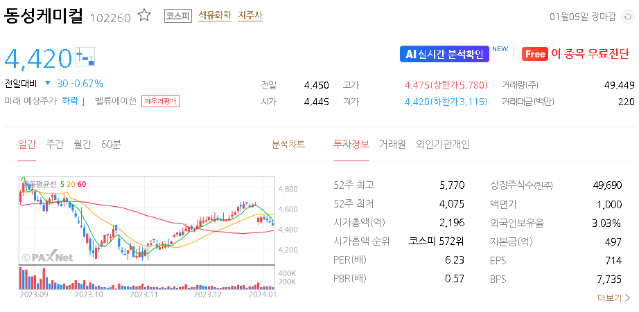 동성케미컬 현재 주가는 4,450원이며 전일 대비 -30원의 모습을 보이고 있습니다. 동성케미컬의 주주현황을 살펴보면 디에스티아이 주주가 전체 지분 41.67%를 소유하고 있습니다. 동성케미컬는 화학 기업으로 장중 기준으로 주가는 4,450원 입니다. 동성케미컬의 시가 총액은 2196억 원이며 발행 주식수는 49,689,728주 입니다.