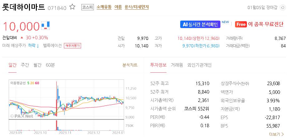 외국인 보유 비중은 3.93% 이며 장중 거래량은 9,352원 을 기록했습니다. 매출액은 20,316억 원을 달성했습니다. EPS는 -4,307원이며 롯데하이마트 주식 배당수익률은 2.45% 입니다.