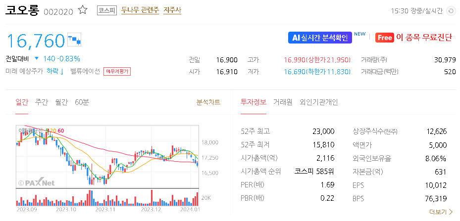 외국인 보유 비중은 8.06% 이며 장중 거래량은 21,875원 을 기록했습니다. 매출액은 42,830억 원을 달성했습니다. EPS는 없음원이며 코오롱 주식 배당수익률은 12.03% 입니다.
