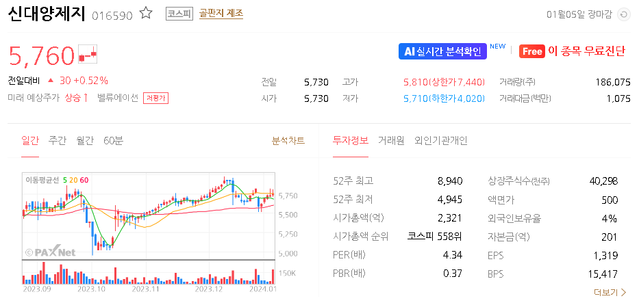 외국인 보유 비중은 4.00% 이며 장중 거래량은 36,899원 을 기록했습니다. 매출액은 4,801억 원을 달성했습니다. EPS는 없음원이며 신대양제지 주식 배당수익률은 957,743% 입니다.