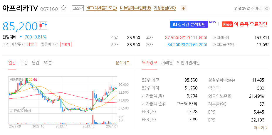 이 글에서는 아프리카TV 주가 전망과 목표 주가, 기업 정보에 대해서 설명합니다. 주식 시장에서 중요한 것은 미래의 기업 가치를 예측하고 선제적으로 움직이는 것입니다. 투자 대상을 선택하기 전에 현재 기업의 현황과 데이터를 확인하는 것이 필요합니다. 아프리카TV 주식의 주요 현황과 투자 정보를 확인하시고 주식 투자에 유용한 정보들을 한 곳에 정리해두었으니 투자 전에 확인하시기 바랍니다.