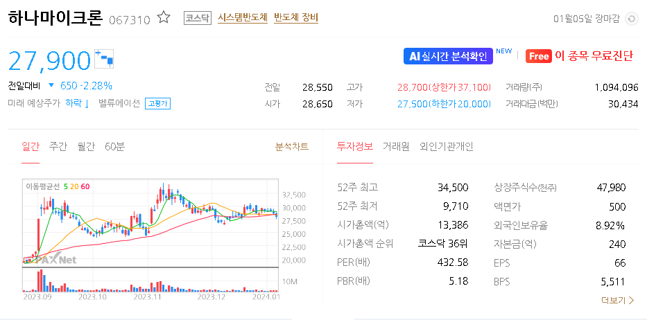 이 글에서는 하나마이크론 주가 전망과 목표 주가, 기업 정보에 대해서 설명합니다. 주식 거래에서 중요한 부분은 현재 기업 가치보다는 미래의 기업 가치를 예측하고 먼저 행동하는 것입니다. 투자할 종목을 고르기 전에 현재 기업의 상황과 지표를 살펴보는 것이 중요합니다. 하나마이크론 주식의 주요 현황과 투자 정보를 확인하시고 주식 투자에 도움이 되는 정보들을 모아 제공하니 투자에 도움을 받으실 수 있을 것입니다.