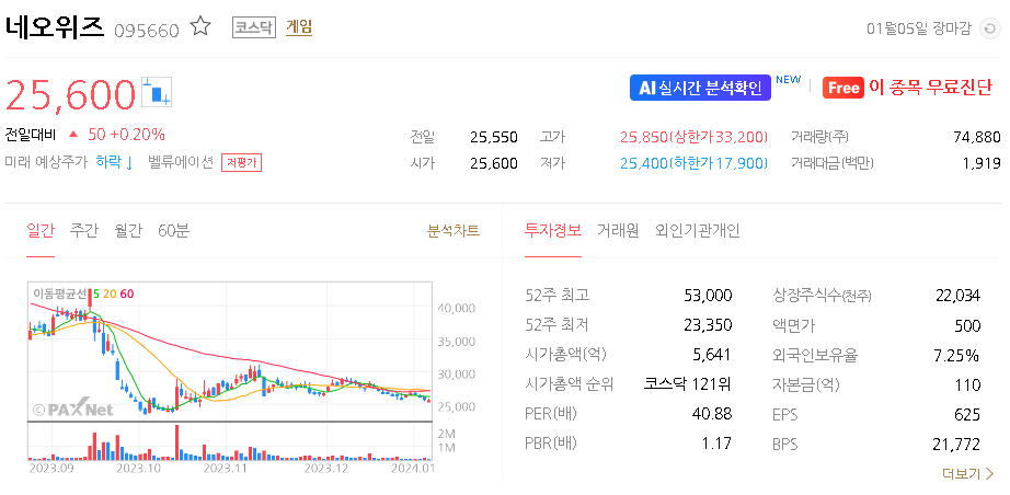 외국인 보유 비중은 7.27% 이며 장중 거래량은 169,634원 을 기록했습니다. 매출액은 2,562억 원을 달성했습니다. EPS는 3,102원이며 네오위즈 주식 배당수익률은 5,630% 입니다.