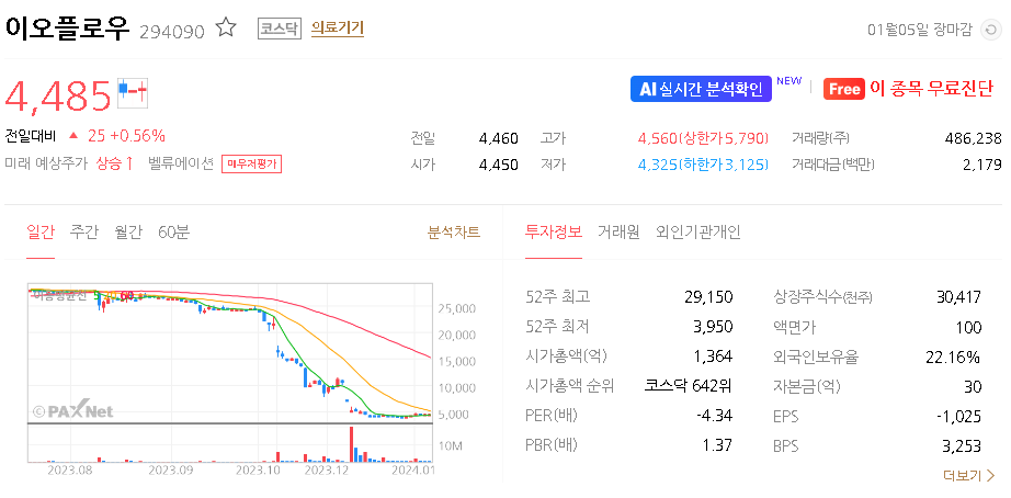 이오플로우 현재 주가는 4,460원이며 전일 대비 -53.05원의 모습을 보이고 있습니다. 이오플로우의 주주현황을 살펴보면 김재진 주주가 전체 지분 10.93%를 소유하고 있습니다. 이오플로우는 의료 장비 및 서비스 기업으로 장중 기준으로 주가는 4,460원 입니다. 이오플로우의 시가 총액은 1364억 원이며 발행 주식수는 30,416,687주 입니다.
