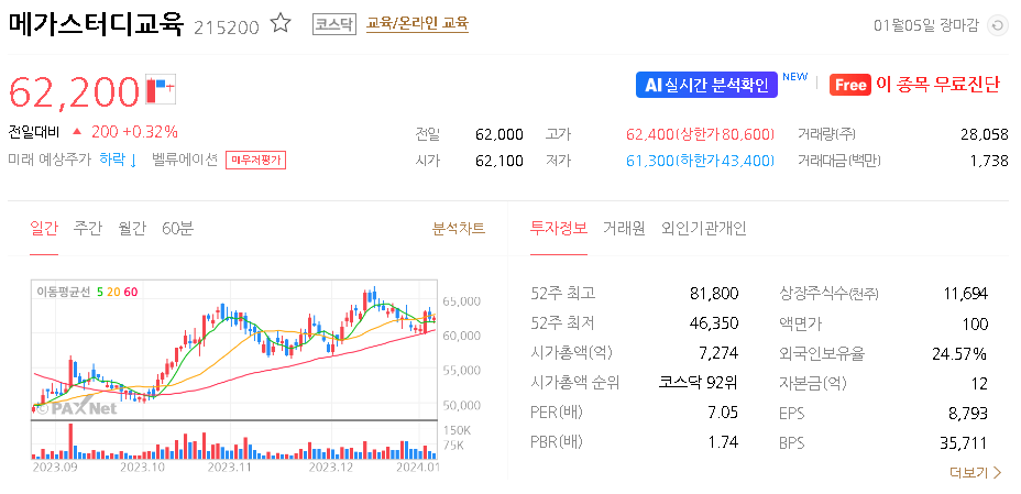 외국인 보유 비중은 24.59% 이며 장중 거래량은 37,942원 을 기록했습니다. 매출액은 7,260억 원을 달성했습니다. EPS는 8,917원이며 메가스터디교육 주식 배당수익률은 2.64% 입니다.